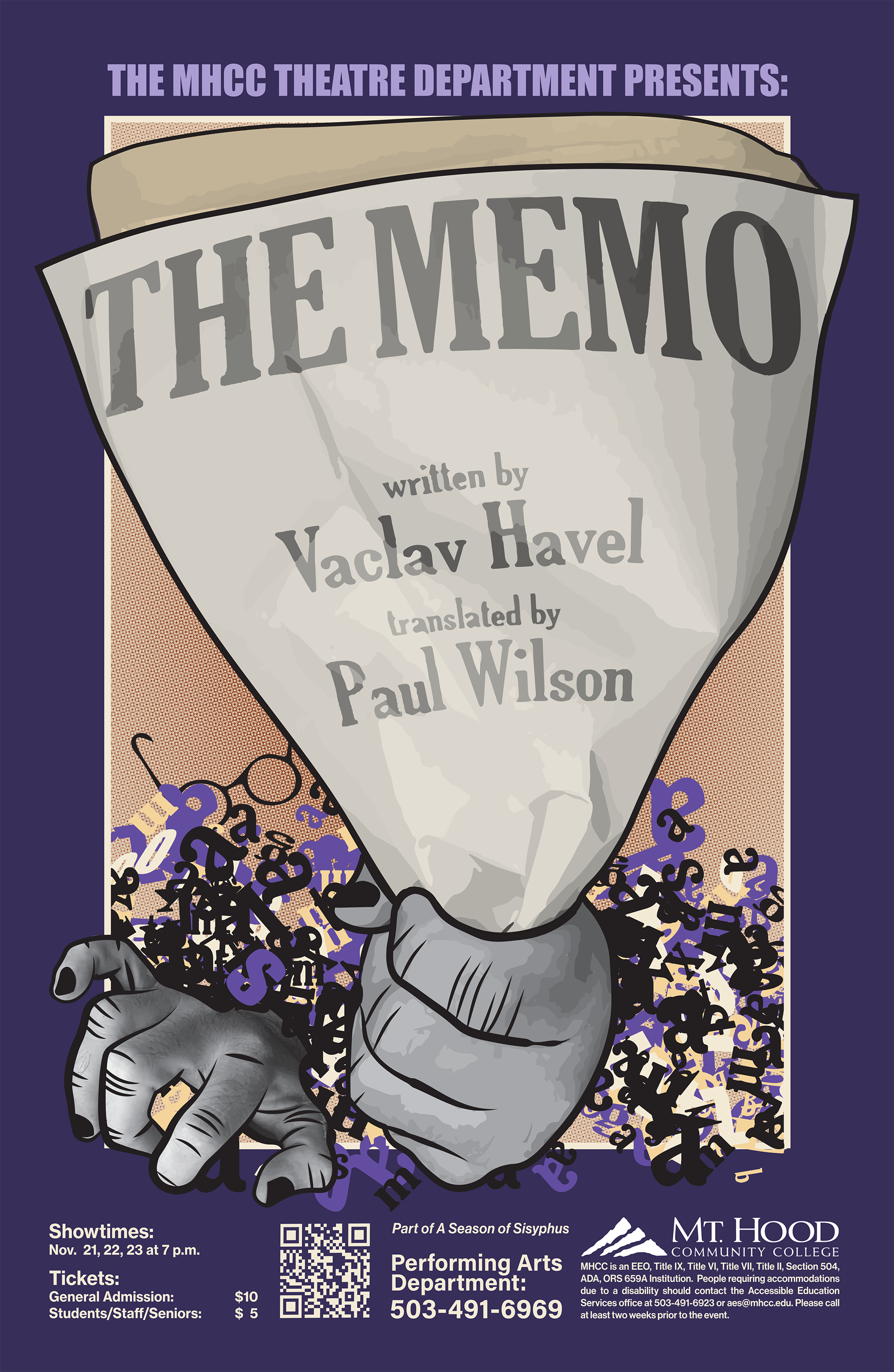 The Mt. Hood CC theater department sought a visually engaging poster to promote The Memo by Václav Havel—a play centered on the absurdity of bureaucracy, dehumanizing corporate language, and systemic control.