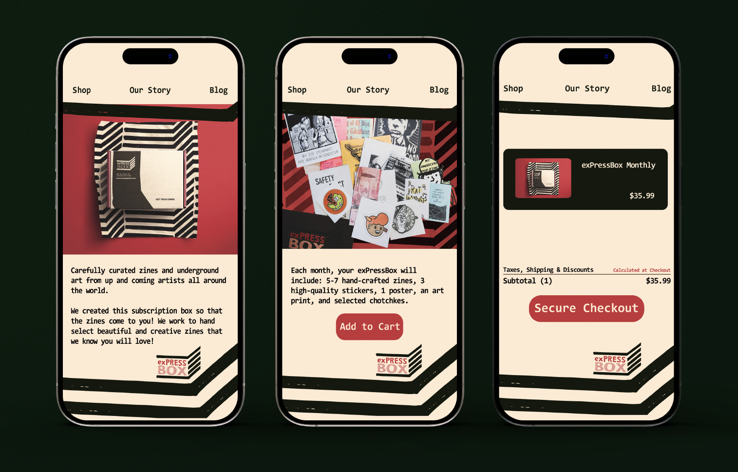 Created a new logo, visual identity, packaging, and a user interface that embodied ExpressBox’s DIY ethos—prioritizing handmade textures, imperfect lines, collage-style elements, and bold typography reminiscent of punk zines and underground art scenes. Every design choice was made to reflect the raw, authentic spirit of grassroots publishing.