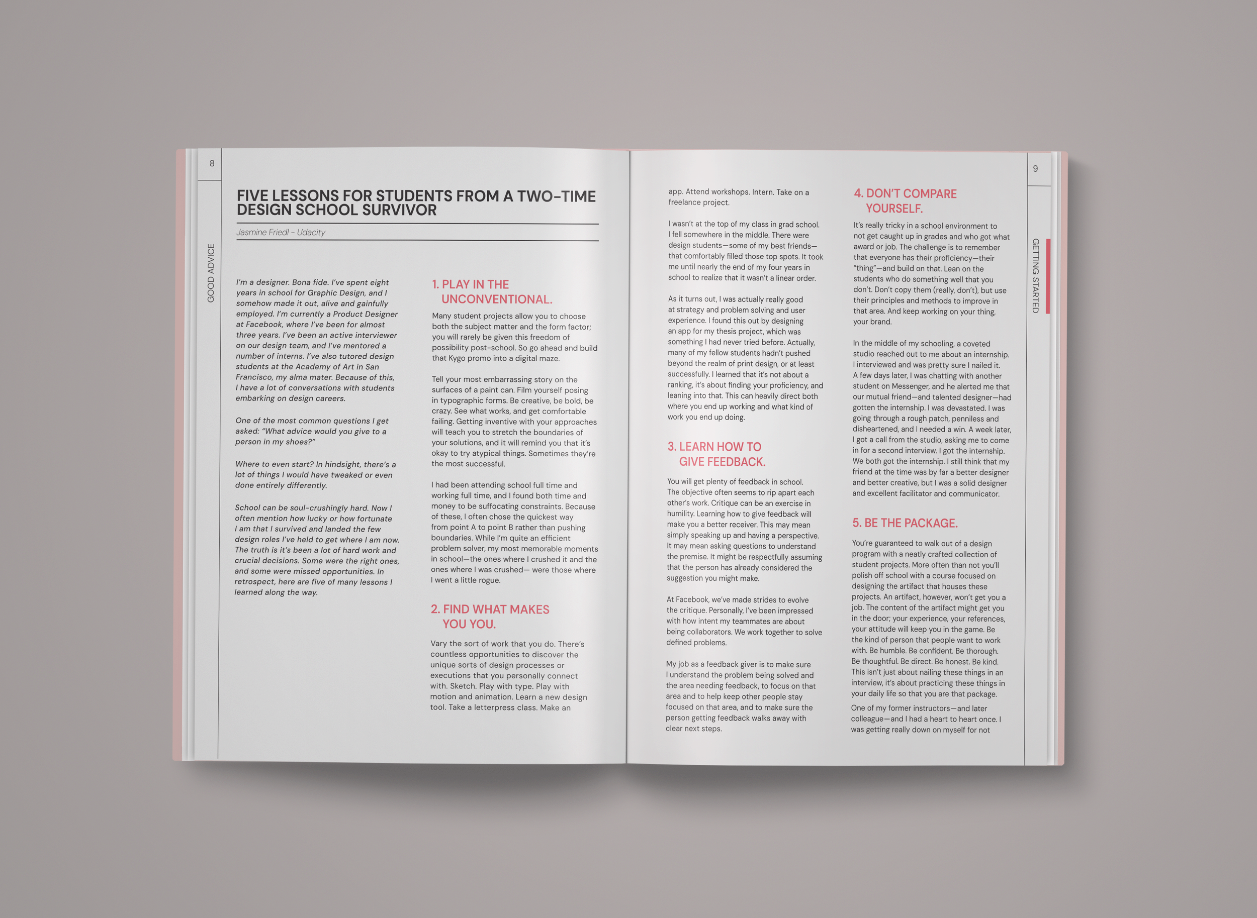 Experimentation with crumpled paper, a visual metaphor for the trial-and-error nature of creative careers, ultimately led to the final cover design. Clean, structured typography. Inside, I developed a layout system that balances cleam, structured typography with colourful ties to the front cover.